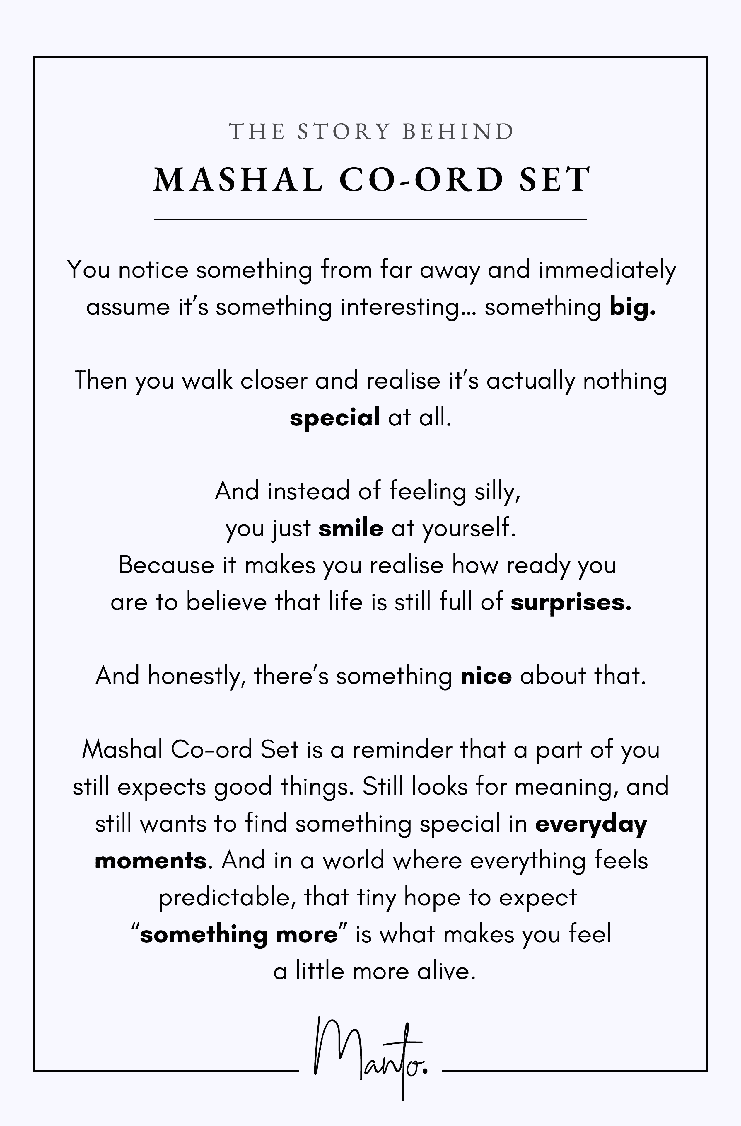 Mashal Co-Ord is a reminder that a part of you still expects good things. Still looks for meaning, and still wants to find something special in everyday moments. And in a world where everything feels predictable, that tiny hope to expect “something more” is what makes you feel a little more alive.