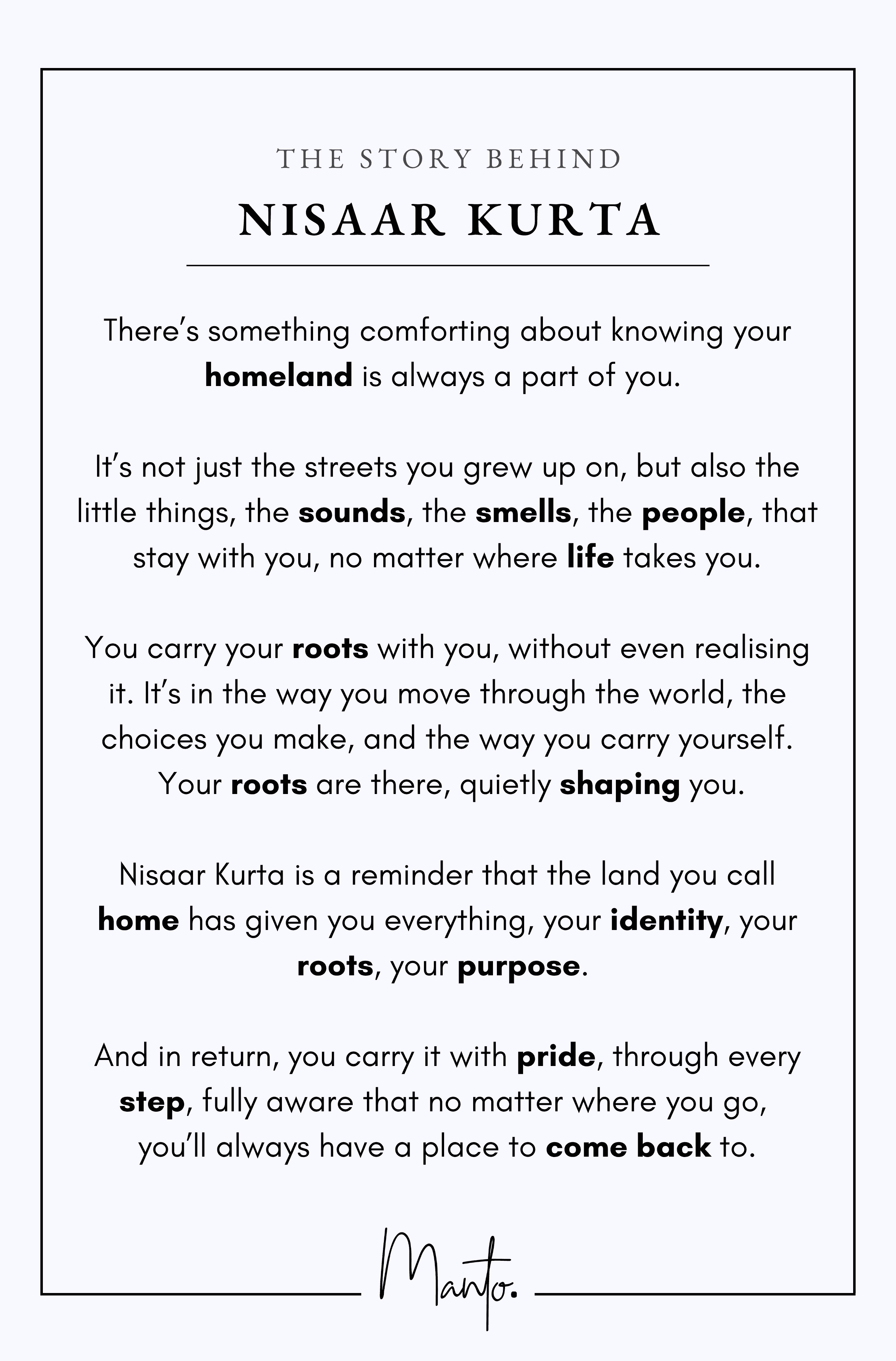 Nisaar Kurta is a reminder that the land you call home has given you everything, your identity, your roots, your purpose. And in return, you carry it with pride, through every step, fully aware that no matter where you go, you’ll always have a place to come back to.