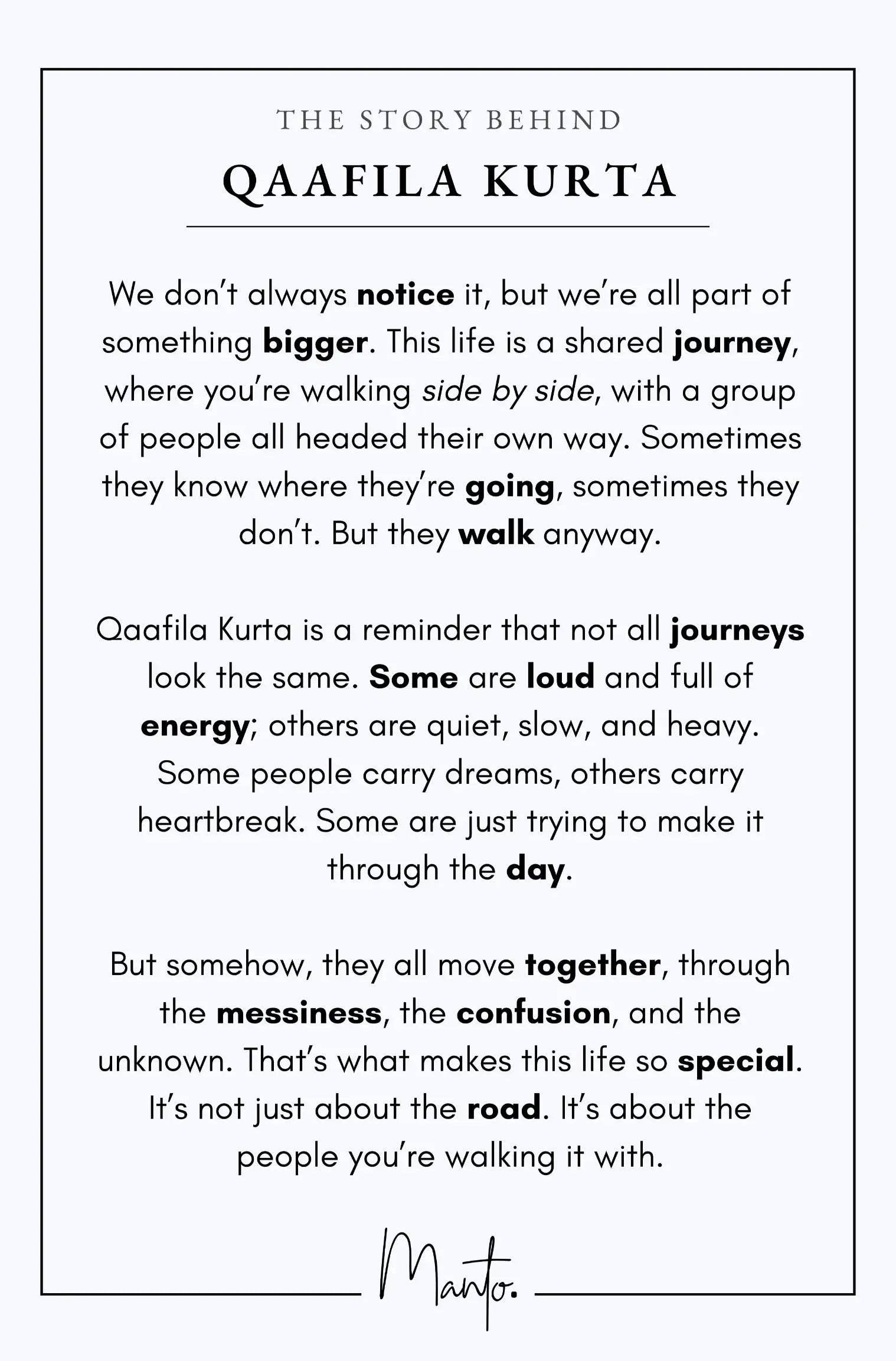 Qaafila Kurta is a reminder that not all journeys look the same. Some are loud and full of energy; others are quiet, slow, and heavy. Some people carry dreams, others carry heartbreak. Some are just trying to make it through the day.