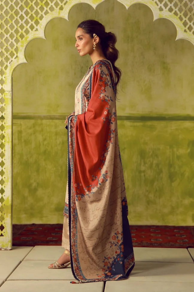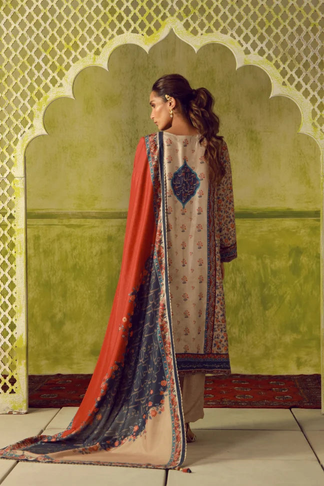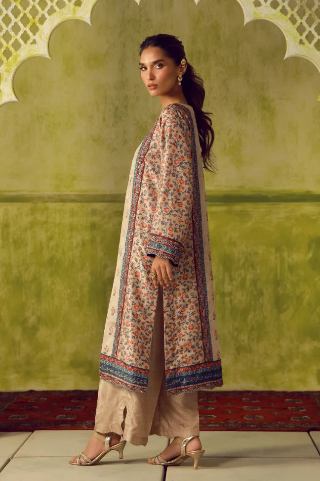 The Mahroosh Set, made from Raw Silk, is a 3-piece set ensemble featuring a long straight shirt paired with Culotte Pants and a Monar Dupatta, this Set is features the words of Sahir Ludhianvi.