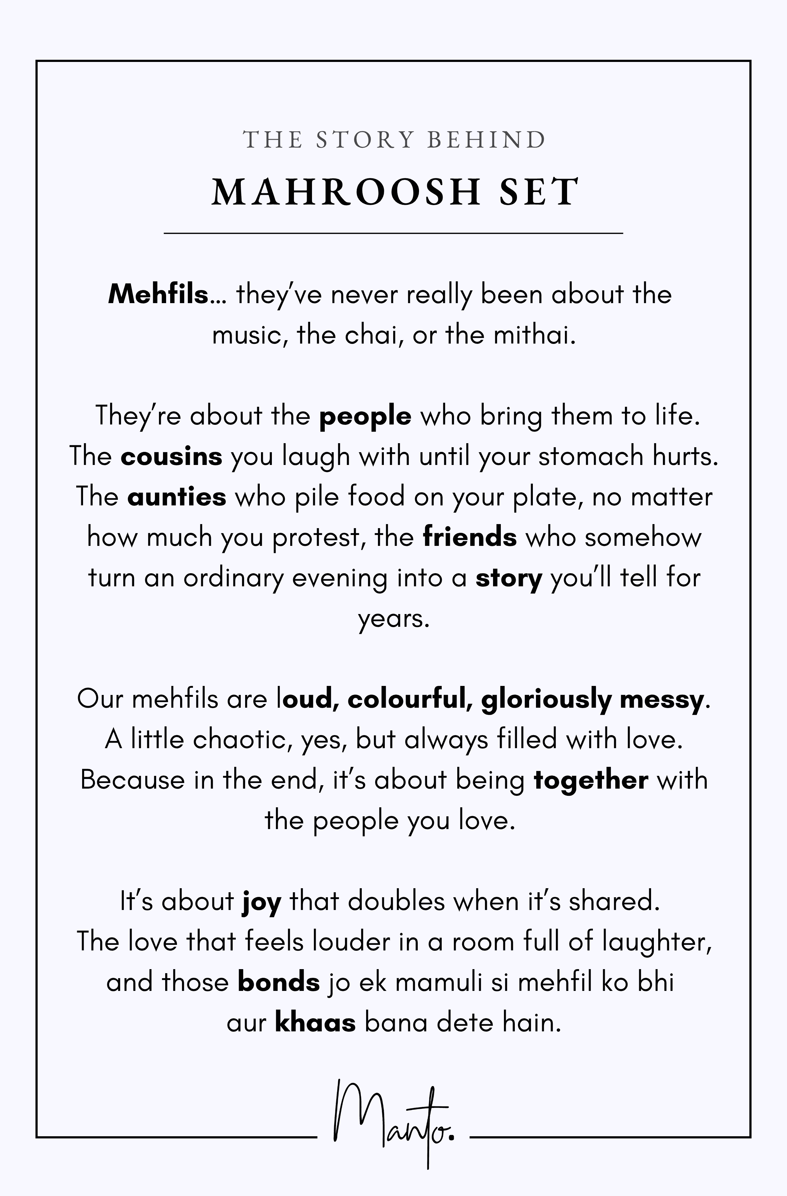 Mehfils… they’ve never really been about the music, the chai, or the mithai. They’re about the people who bring them to life. The cousins you laugh with until your stomach hurts. The aunties who pile food on your plate, no matter how much you protest, the friends who somehow turn an ordinary evening into a story you’ll tell for years.