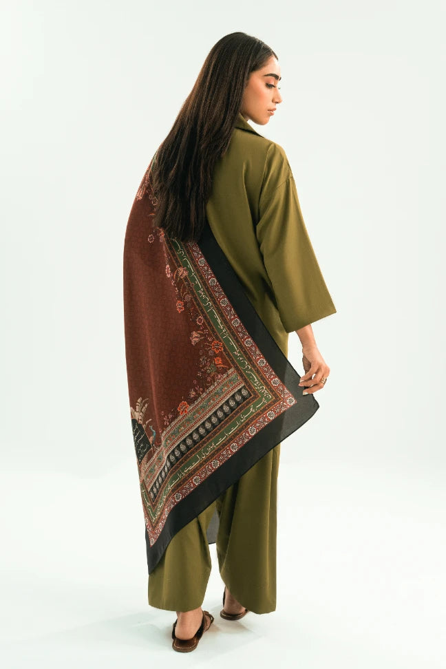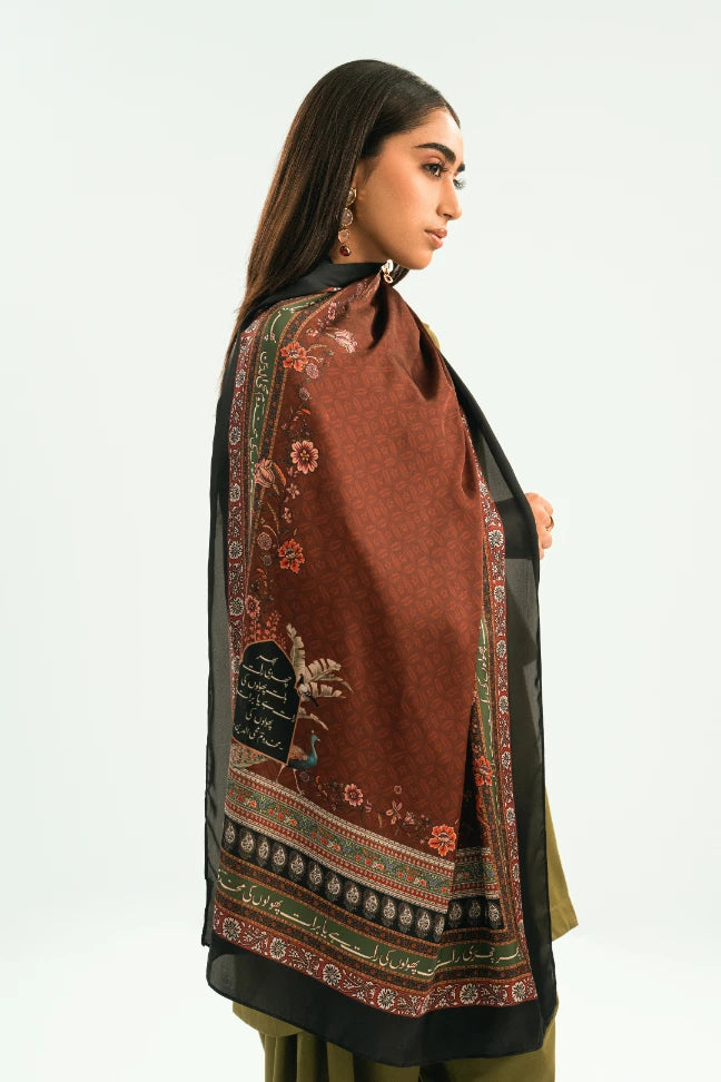 The Shaposh Scarf, made from Satin Silk, is a printed scarf featuring Makhdoom Mohiuddin's poetry calligraphed throughout.