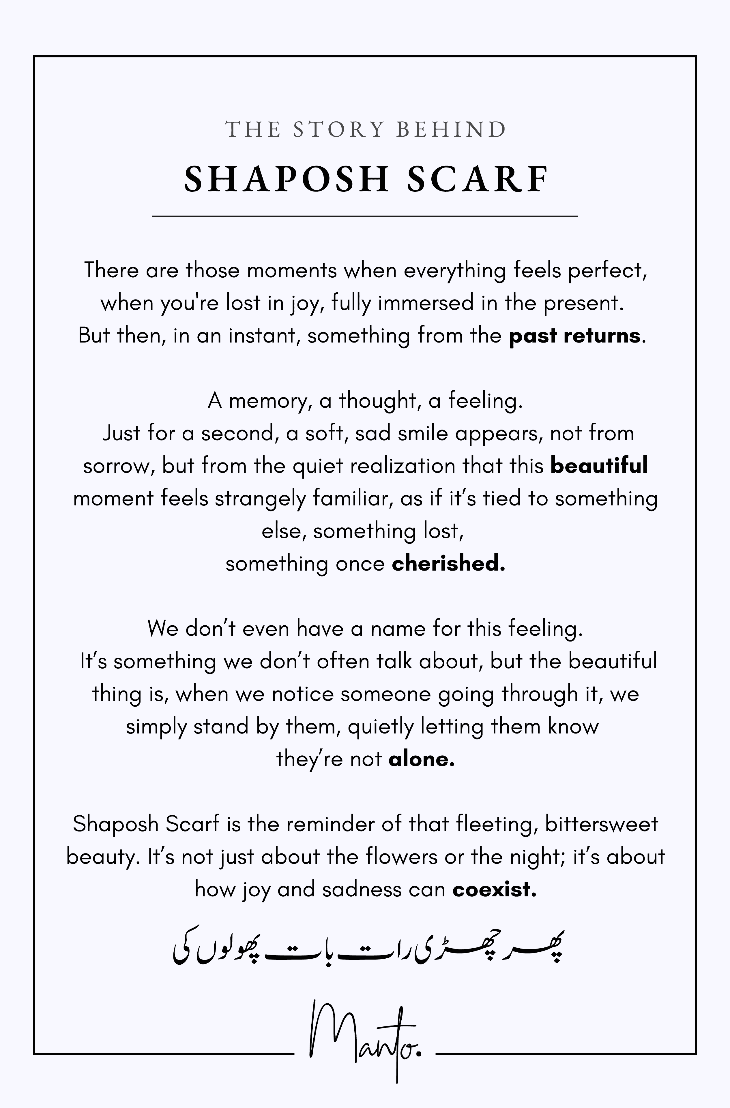 Shaposh Scarf is the reminder of that fleeting, bittersweet beauty. It’s not just about the flowers or the night; it’s about how joy and sadness can coexist.