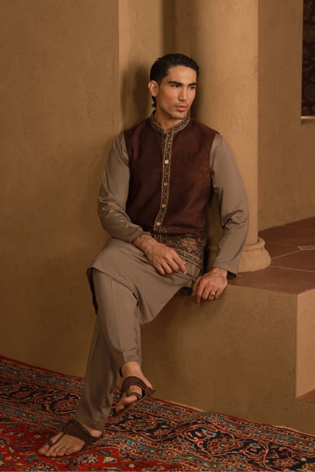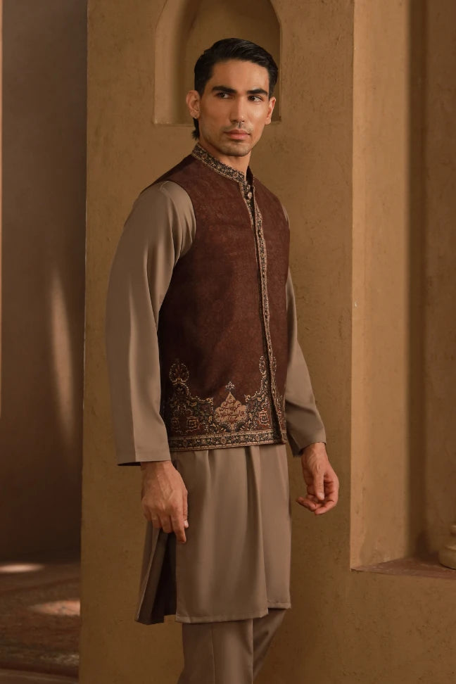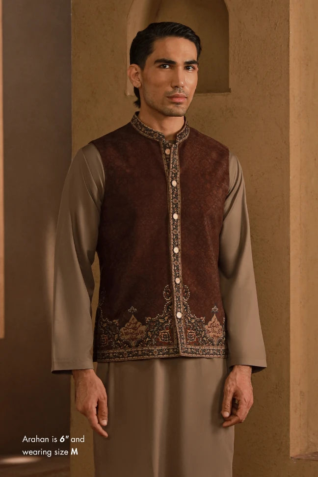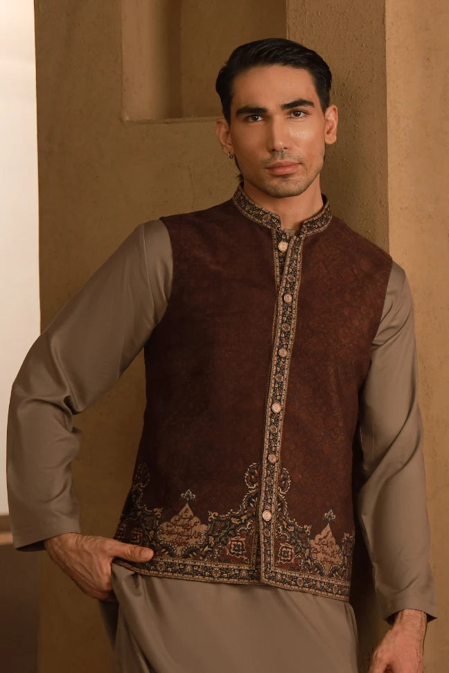 Premium velvet waistcoat featuring Urdu calligraphy of Jigar Moradabadi across.