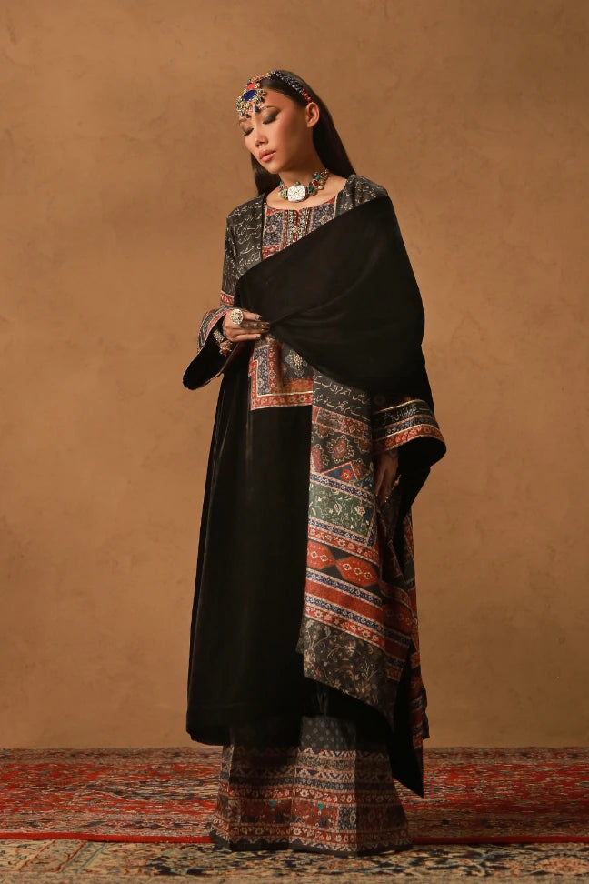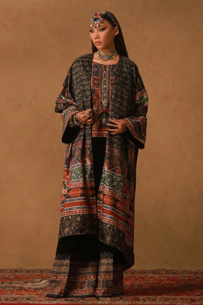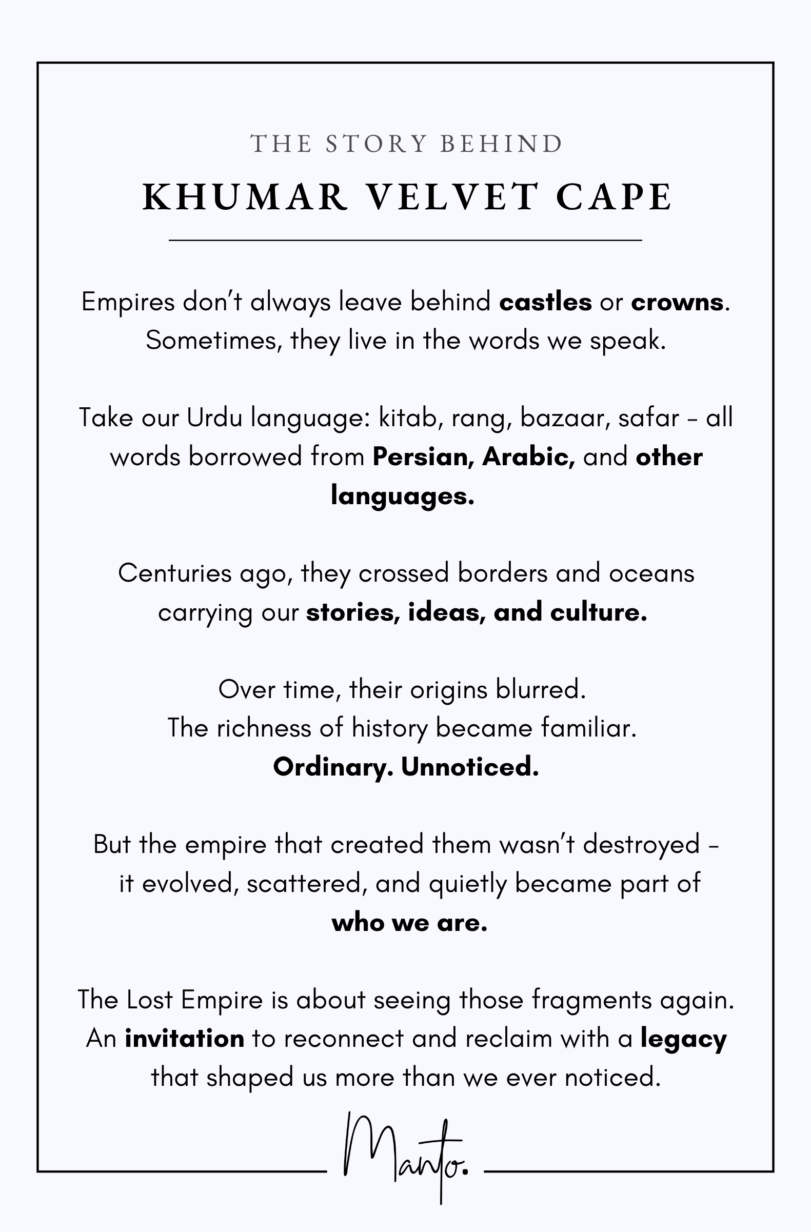 Khumar Cape, is a reversible cape! Made with premium Velvet, and printed Raw Silk. Allowing you to wear it either way and make a statement! This Cape features the words of Jigar Moradabadi.
