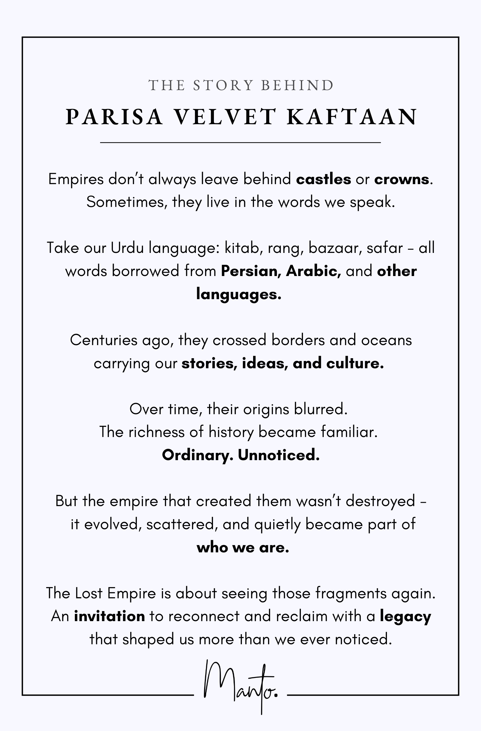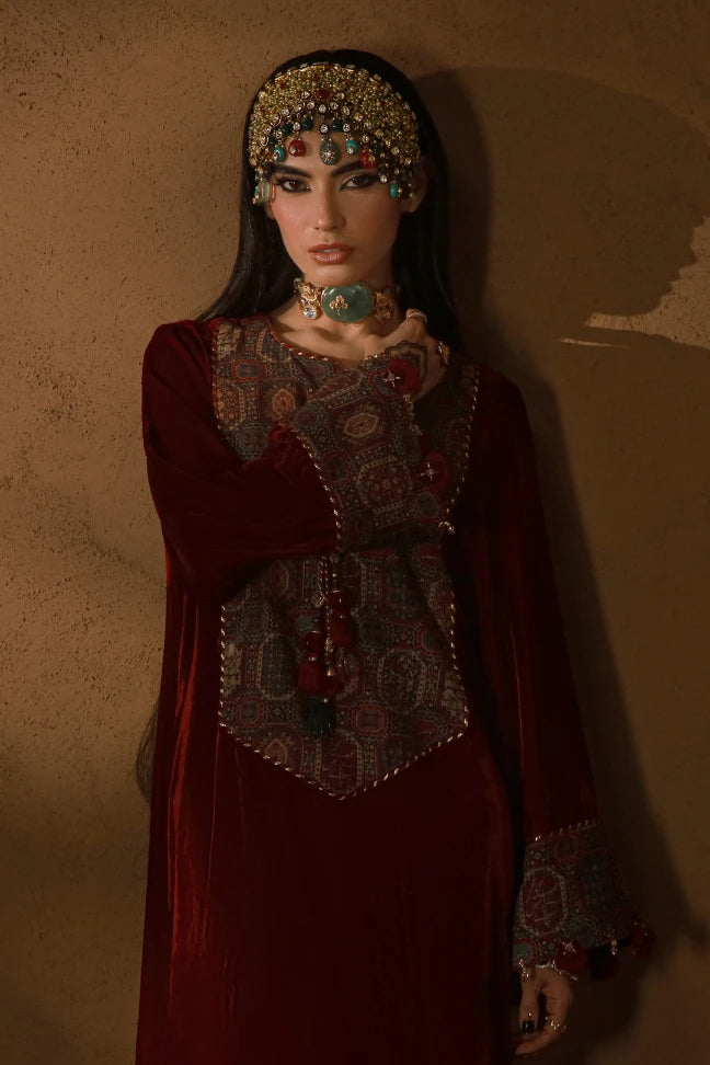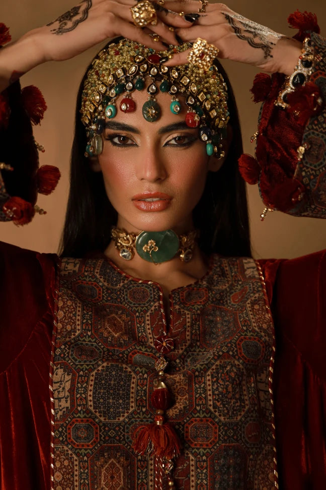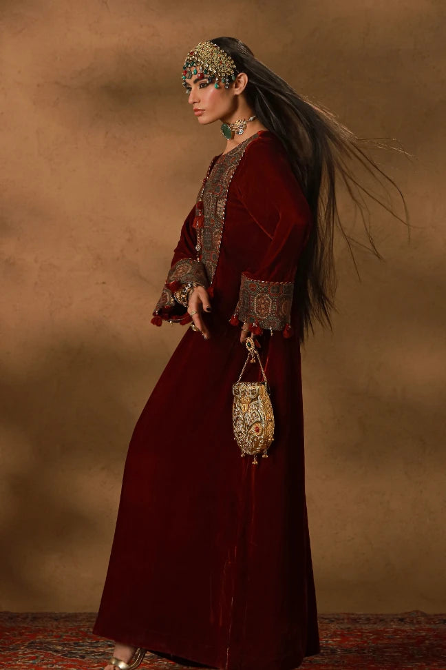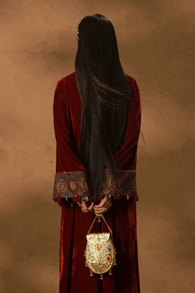 Premium Velvet Kaftaan with patchwork, embellished tassels and dori detailing on the neckline and the sleeves. Featuring the words of Nida Fazli.