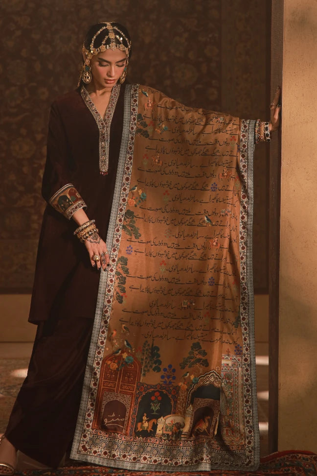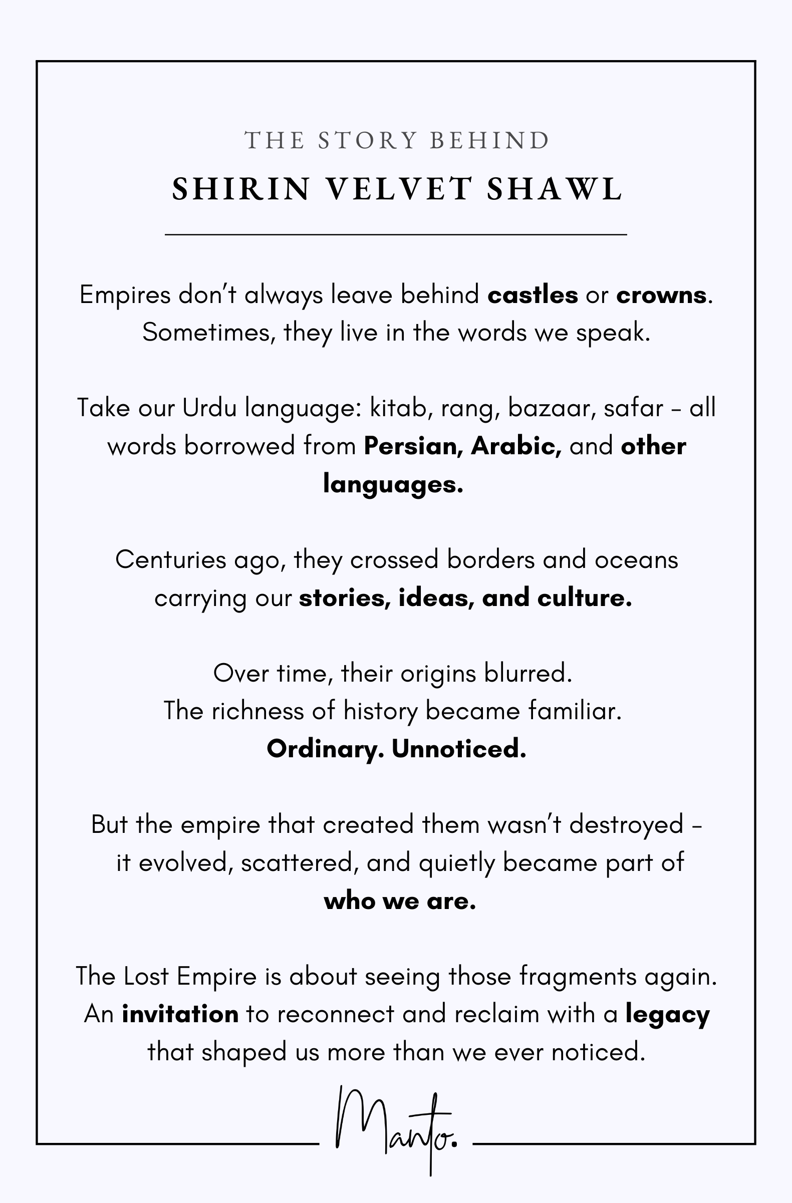Shirin Shawl is a reversible piece crafted in premium velvet, with a printed raw silk back, features the timeless words of Sahir Ludhianvi.