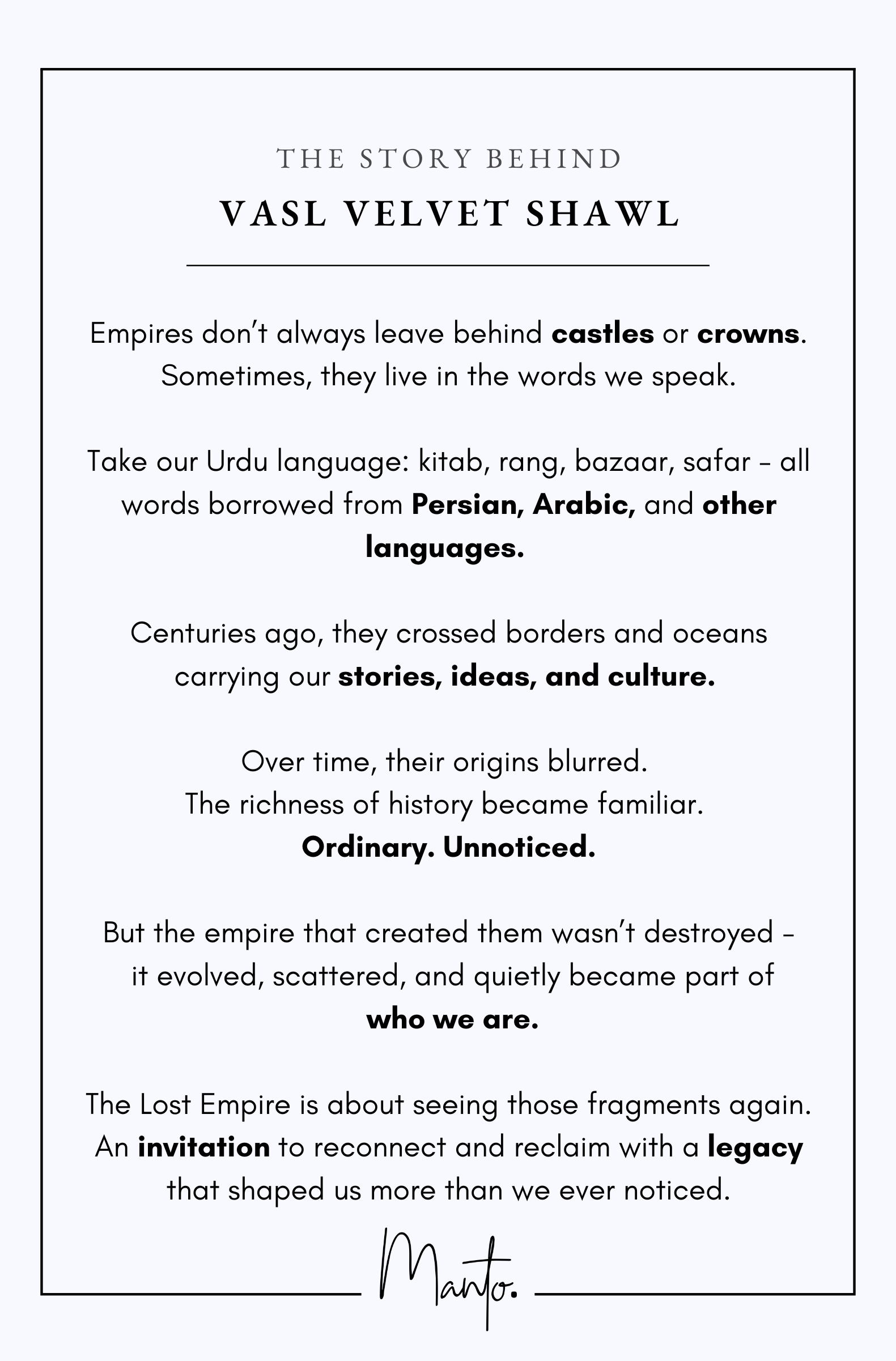 Vasl Shawl, is made with premium Velvet. This shawl features the Urdu words such as raqs, shajar, vasl, sehr.