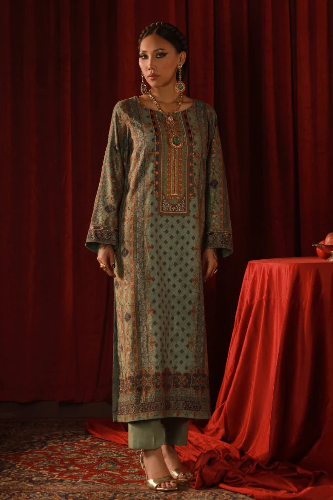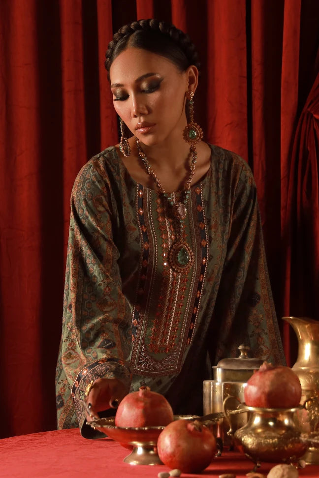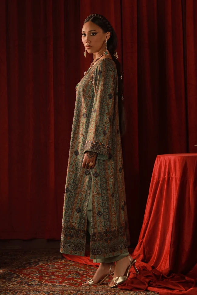 Zebunissa Set, is a premium 2-piece Set with a long A-line velvet shirt paired with raw silk straight pants.
