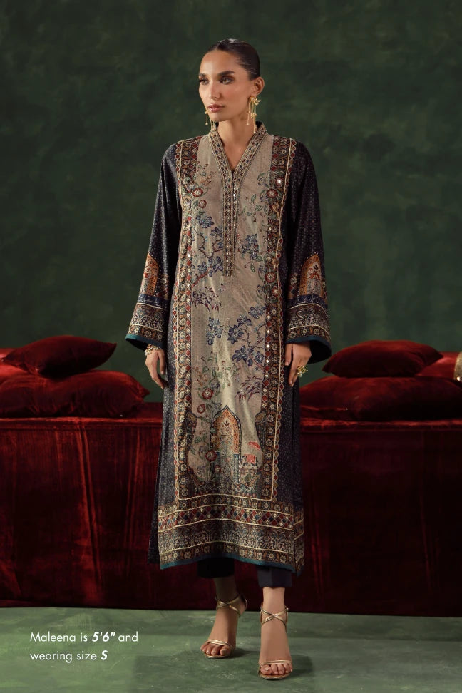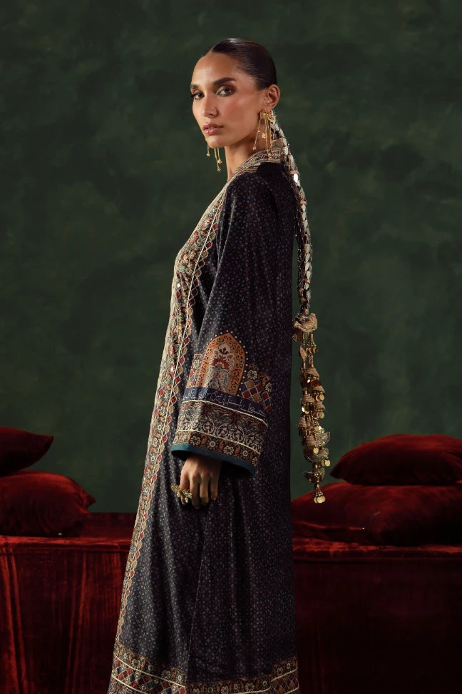 Kehkashan Velvet Set features a straight long velvet shirt, paired with a raw silk straight pant. This Co-Ord Set features the words of Allama Iqbal.