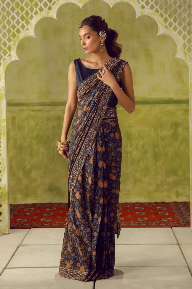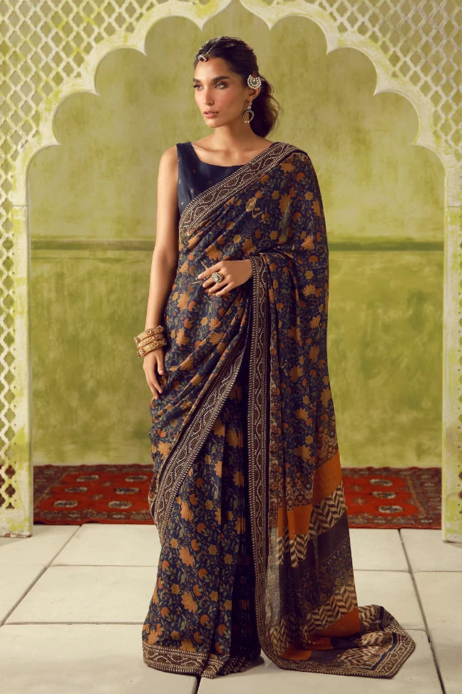Khoobsurat is a cotton silk ready-to-wear saree with a Banarsi blouse and an embroidered border, featuring Urdu words calligraphed throughout. Available in 2 Colors.