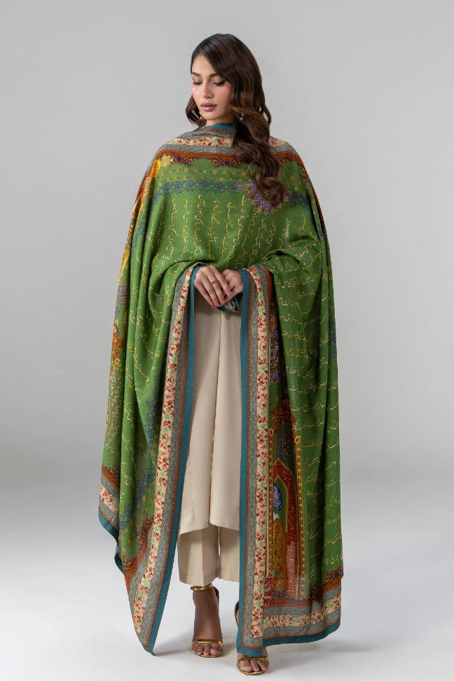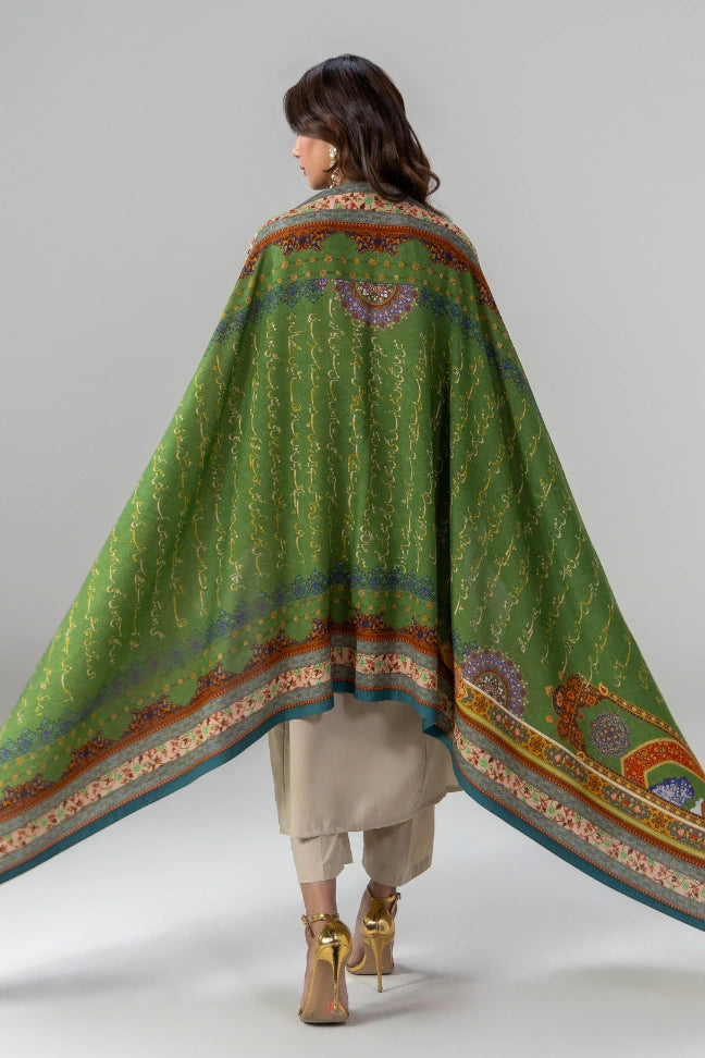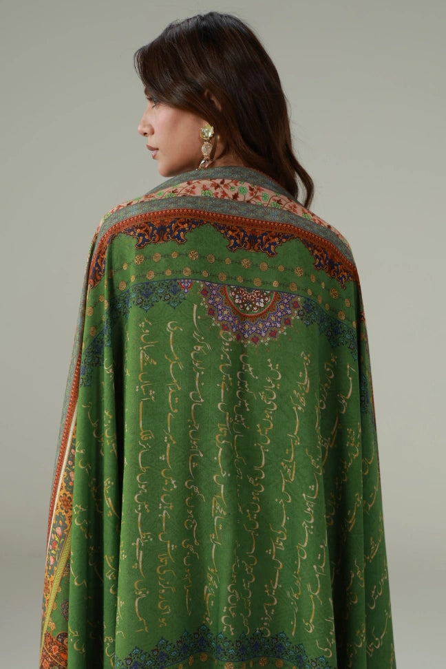 Andaaz Odhni, made from cotton silk, features the words of Shafiq Barelvi calligraphed throughout.