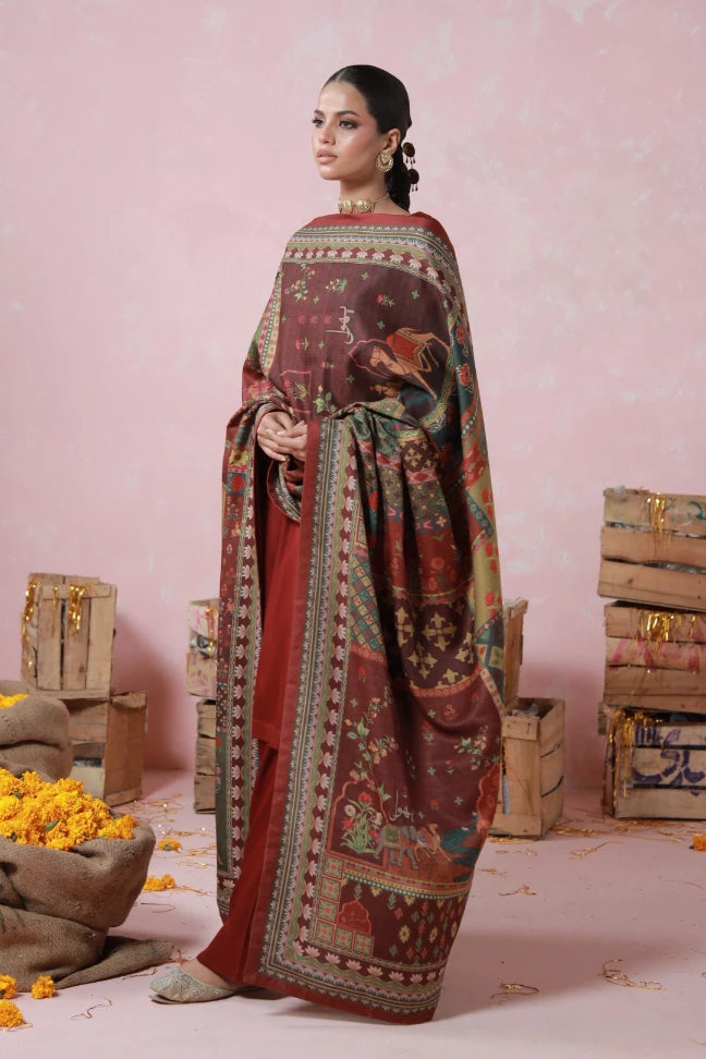 Gulposh Shawl is a double-sided shawl, featuring the words of Makhdoom Mohyuddin calligraphed throughout.