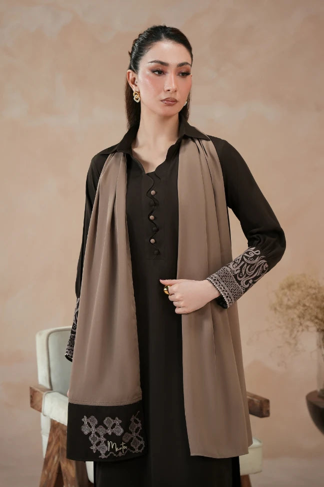 The Zeen Scarf, made using Georgette, with a dark brown border at one end, featuring geometric embroidered motifs.