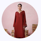 Red 2 piece herringbone set with a short shirt and shalwar, featuring urdu words.