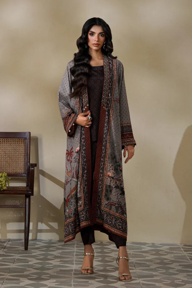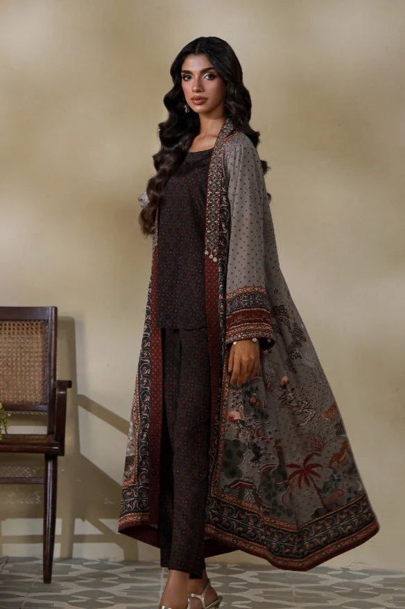 Front-open long length printed shrug, featuring Urdu calligraphy of poetry by Sahir Ludhianvi. Pair it with matching Inner Set to complete the look!