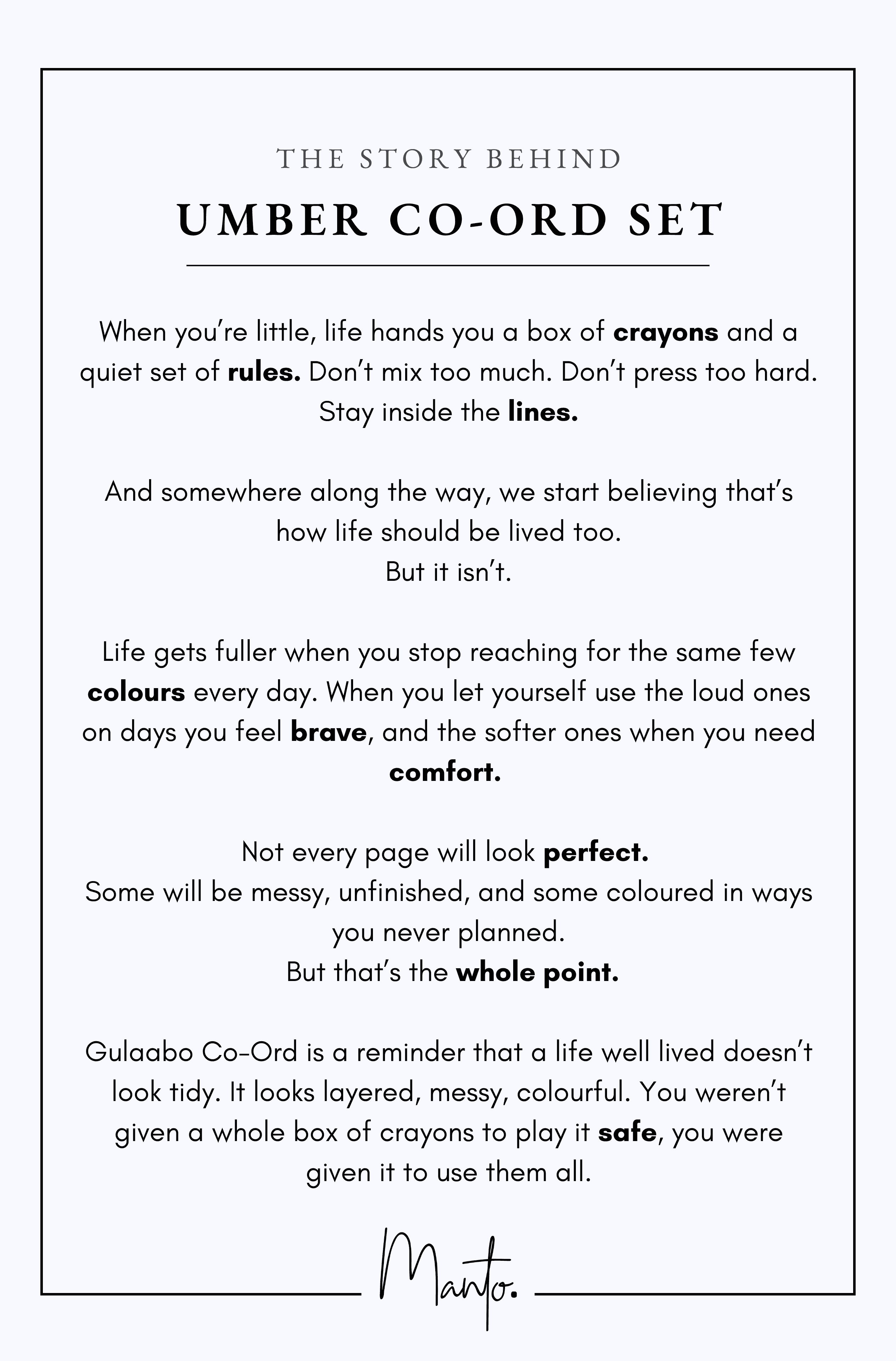 Umber Co-Ord is a reminder that a life well lived doesn’t look tidy. It looks layered, messy, colourful. You weren’t given a whole box of crayons to play it safe, you were given it to use them all.