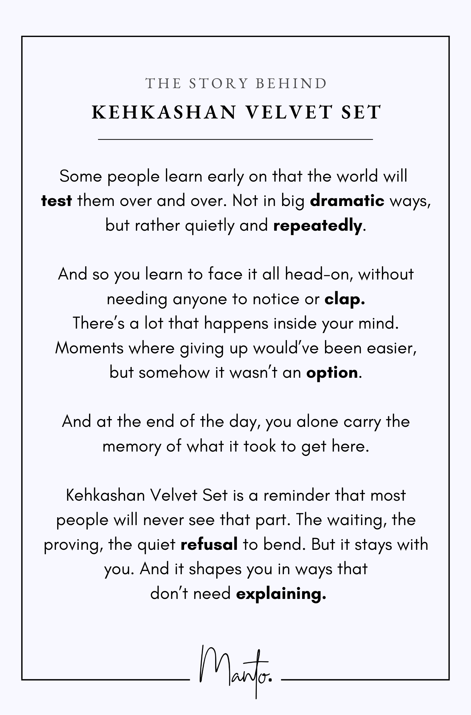 Kehkashan Velvet Set is a reminder that most people will never see that part. The waiting, the proving, the quiet refusal to bend. But it stays with you. And it shapes you in ways that don’t need explaining.