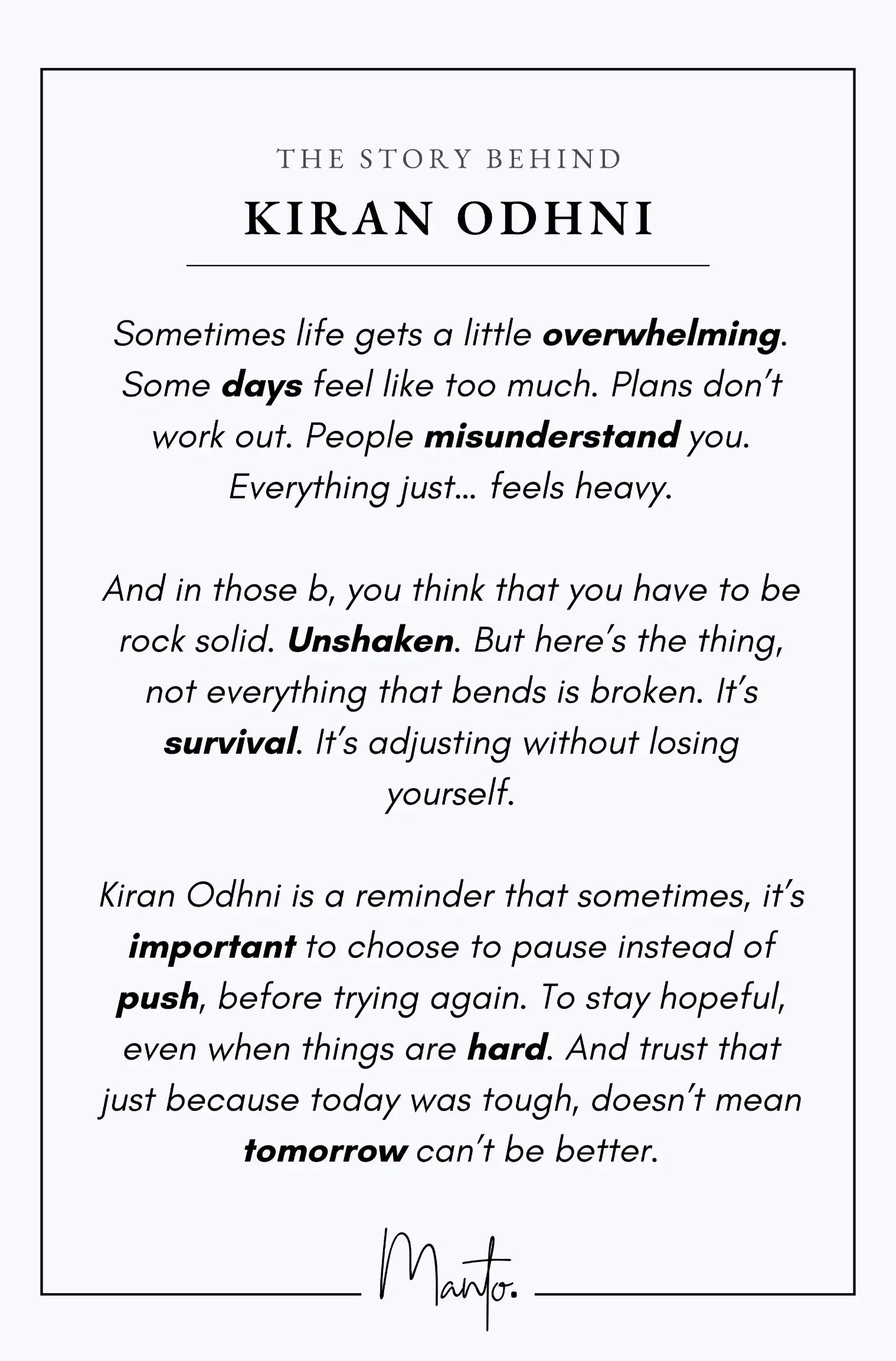 Kiran Odhni is a reminder that sometimes, it’s important to choose to pause instead of push, before trying again. To stay hopeful, even when things are hard. And trust that just because today was tough, doesn’t mean tomorrow can’t be better.