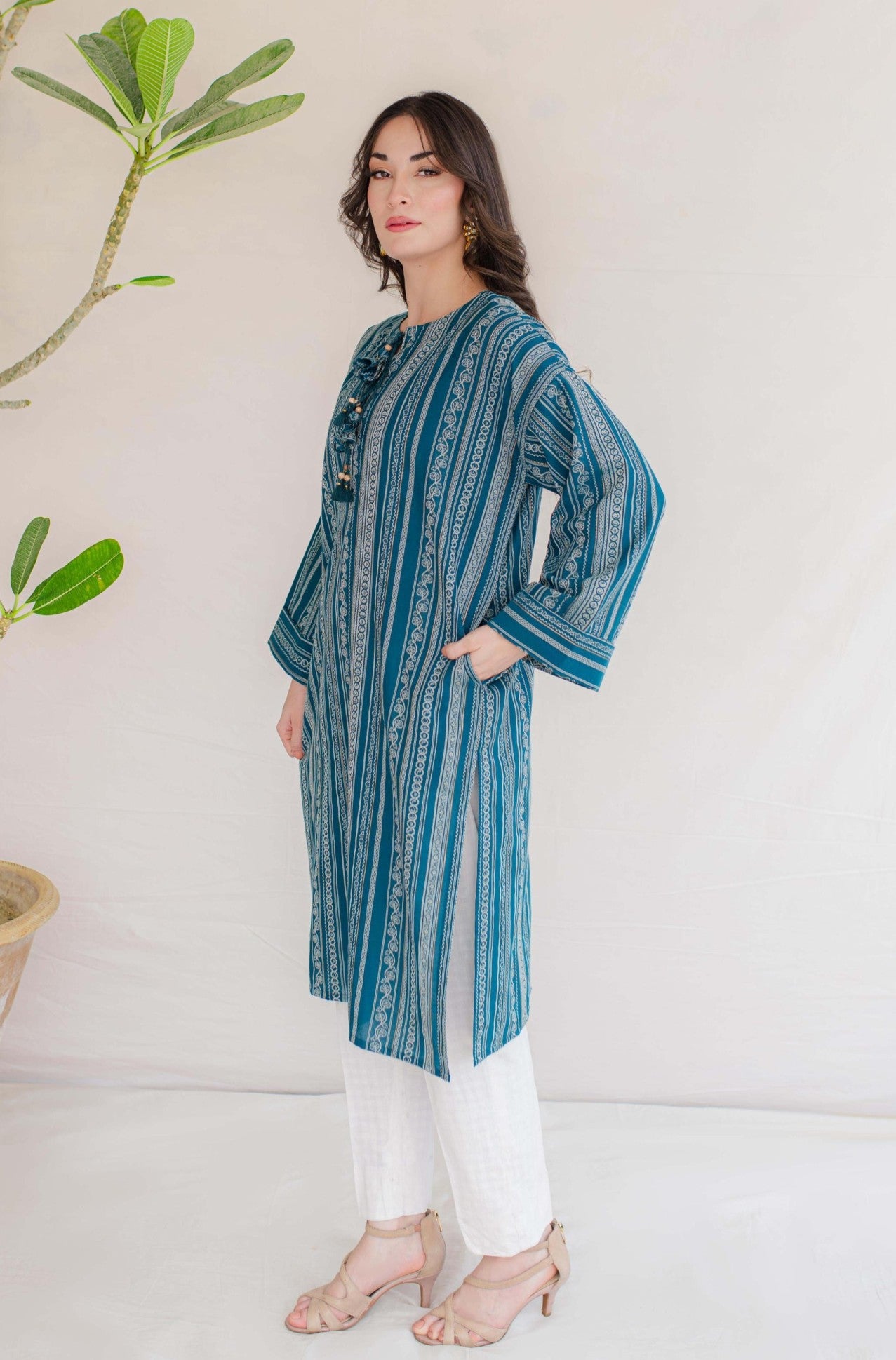 The Manzil Weaved Kurta, made from Jacquard, is a Loose Fit Short Kurta featuring urdu letters م , ن, ت, و